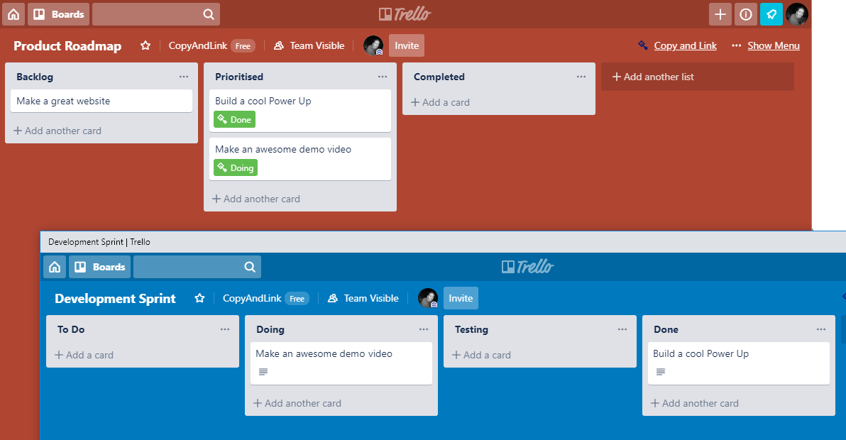 In this example, we look at one way to use Trello and the Copy & Link Power-Up to manage a software development life-cycle that caters to both a Product Manager and a Development Team.