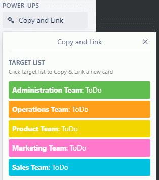 Open a Trello card you want copied into the destination board. Click Copy and Link in the Power-Ups section on the right. Click Copy Card and Link. The new card will be created and automatically linked!